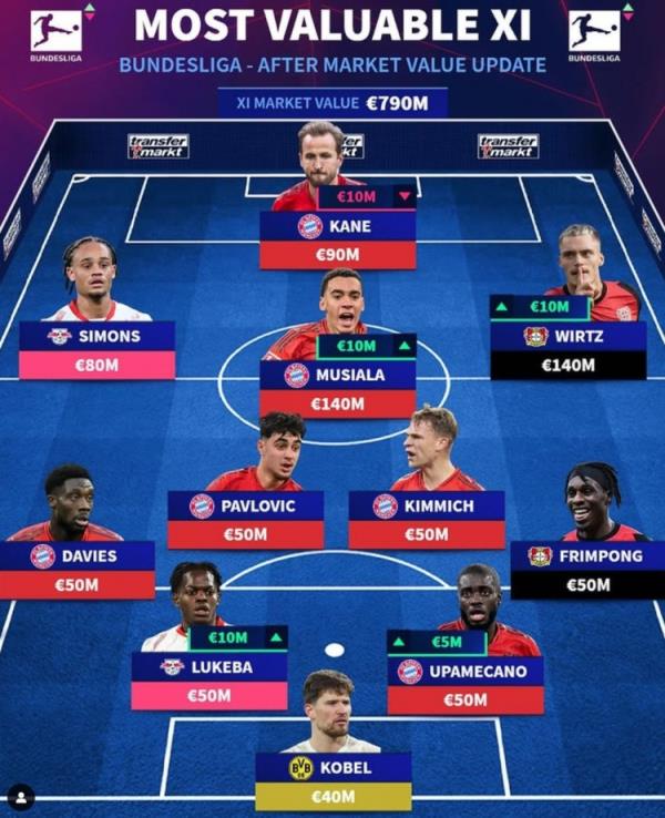德轉(zhuǎn)列德甲最貴陣:穆西亞拉領銜拜仁6將,維爾茨、西蒙斯在列